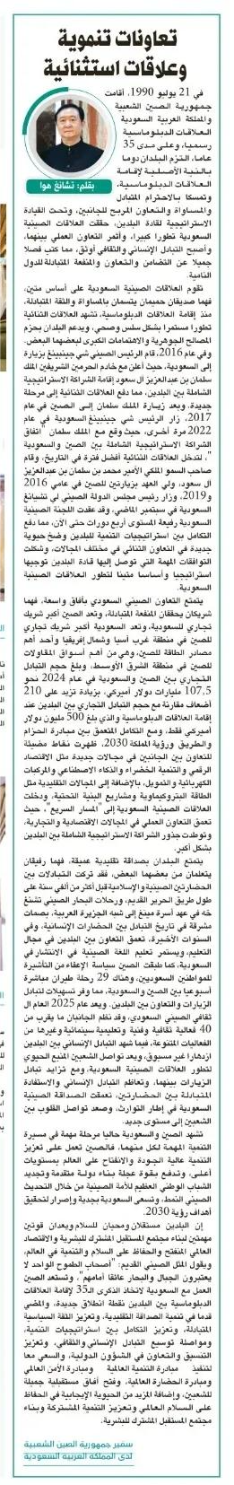 2025年7月21日,驻沙特大使常华在《利雅得报》发表署名文章《传承友谊 共创未来》,全文如下:
