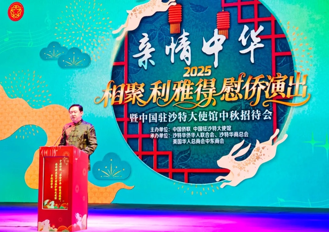 2025年10月3日,驻沙特使馆举行中秋招待会,中国侨联献上“亲情中华—相聚利雅得”慰侨演出,驻沙特大使常华出席。中国侨联代表团,以及在沙华侨华人、教师留学生、中资机构员工代表等600余人欢聚一堂,共庆佳节、共话团圆。
