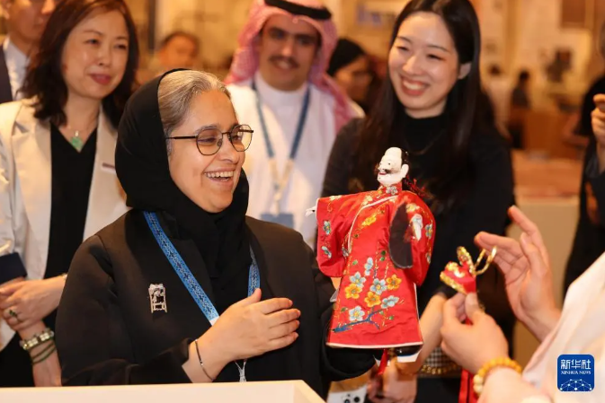 11月13日,在沙特首都利雅得,嘉宾在第三届沙特阿拉伯国际手工艺周中国馆欣赏木偶。新华社记者 王海洲 摄