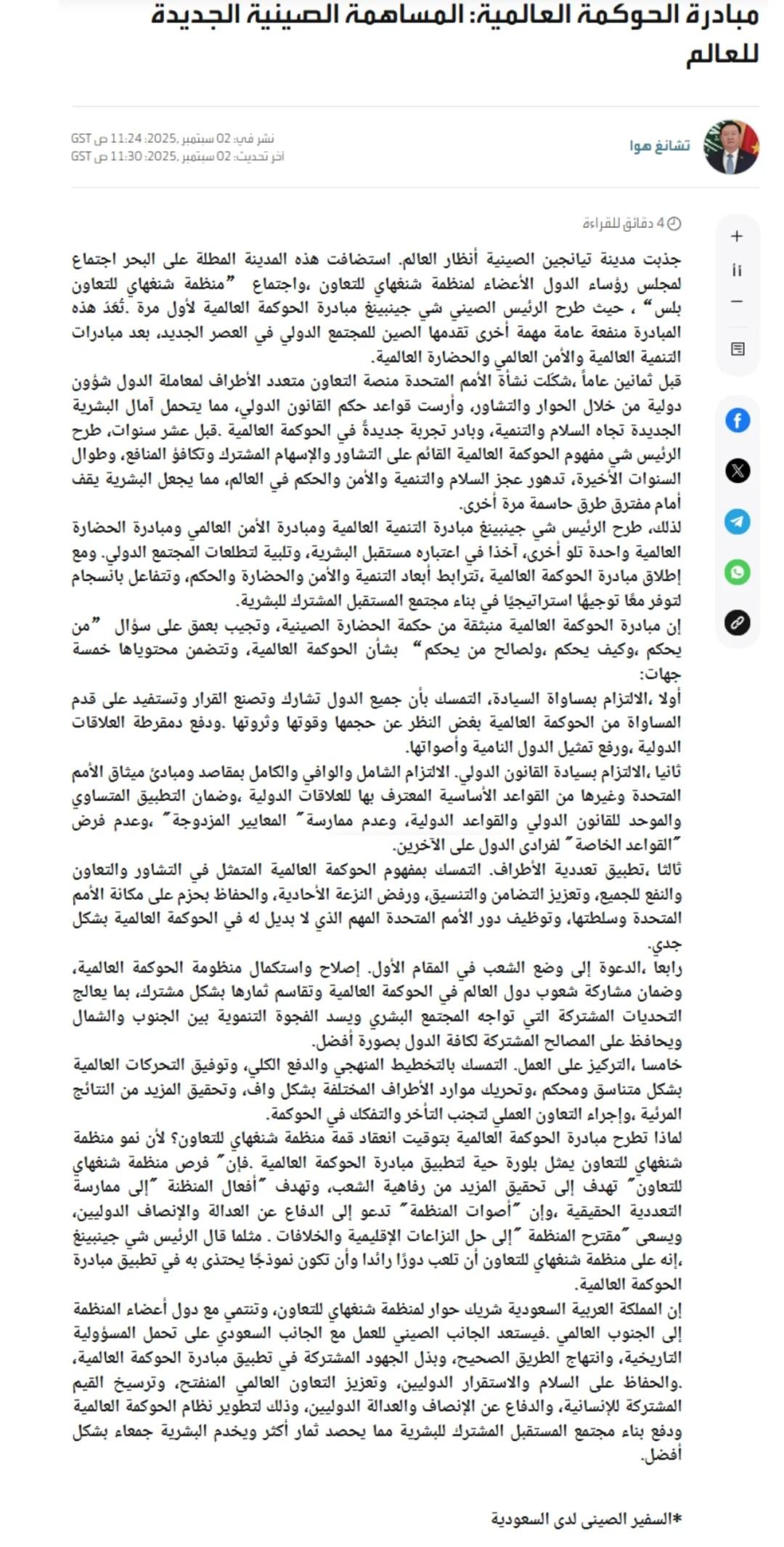 2025年9月2日,中东主流媒体阿拉比亚电视台网站刊登驻沙特大使常华署名文章《全球治理倡议中国对世界的新贡献》,全文如下: