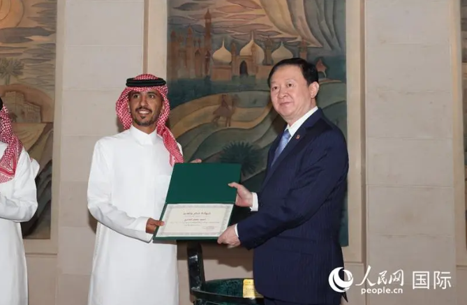 中国驻沙特大使常华向沙特见义勇为青年颁发感谢状。人民网记者 任皓宇摄
