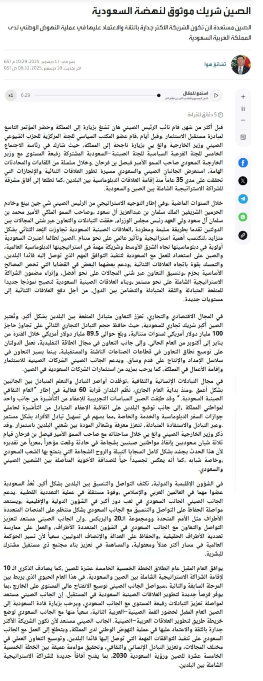2025年12月17日,驻沙特大使常华在沙主流媒体阿拉比亚电视台网站发表署名文章《中国愿做沙特国家振兴进程中最可信赖、最可依靠的伙伴》,全文如下: